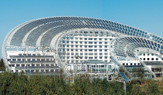 Baptizada de Altar do Sol e da Lua, o maior prédio movido a energia solar do mundo localiza-se em Dezhou na China. A construção tem 75 mil metros quadrados e inclui um centro de exposições, escritórios, centros de pesquisa cientifica, salas de reunião, entre outros. A cor predominante, o branco, representa a energia limpa e ajuda a reflectir o sol (reduzindo o calor), e a forma do edifício foi inspirada num relógio de sol. O isolamento e os painéis solares são factores decisivos para a classificação do Altar do Sol e da Lua como o maior prédio movido a energia solar do mundo.
