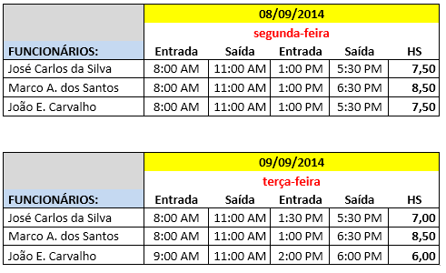 Com este Time Sheet podemos observar que precisamos melhorar a produtividade dos funcionários José Carlos da Silva e Marco Aurélio dos Santos.
