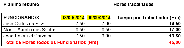 Analisando a Planilha resumo temos que os 3 (três) funcionários concluíram os serviços em 02 (dois) dias (08/09/2014 e 09/09/2014).